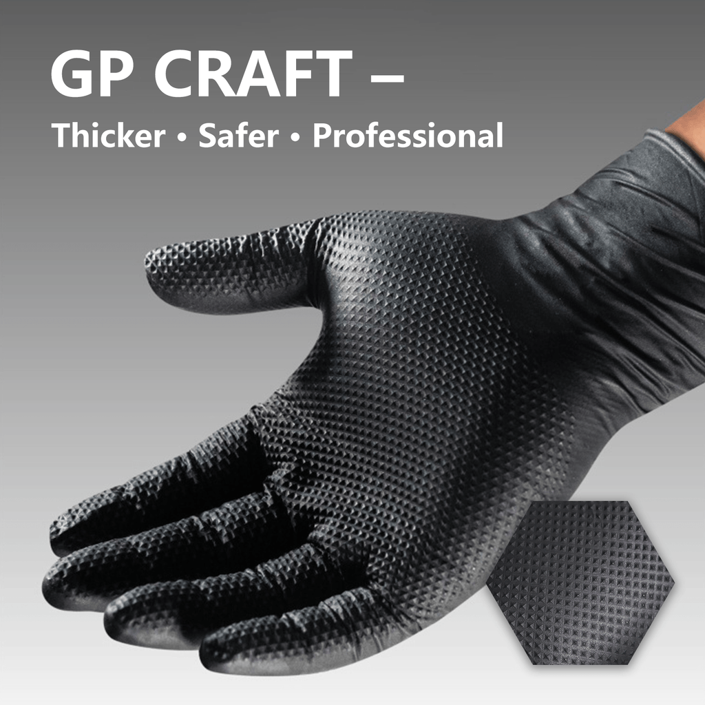 Choose GP Craft 8 mil Black Nitrile Exam Gloves, Diamond Textured, and Powder Free for unmatched protection, grip, and comfort in all your heavy-duty tasks. These gloves are designed to meet the highest standards of performance, making them the preferred choice across various industries.